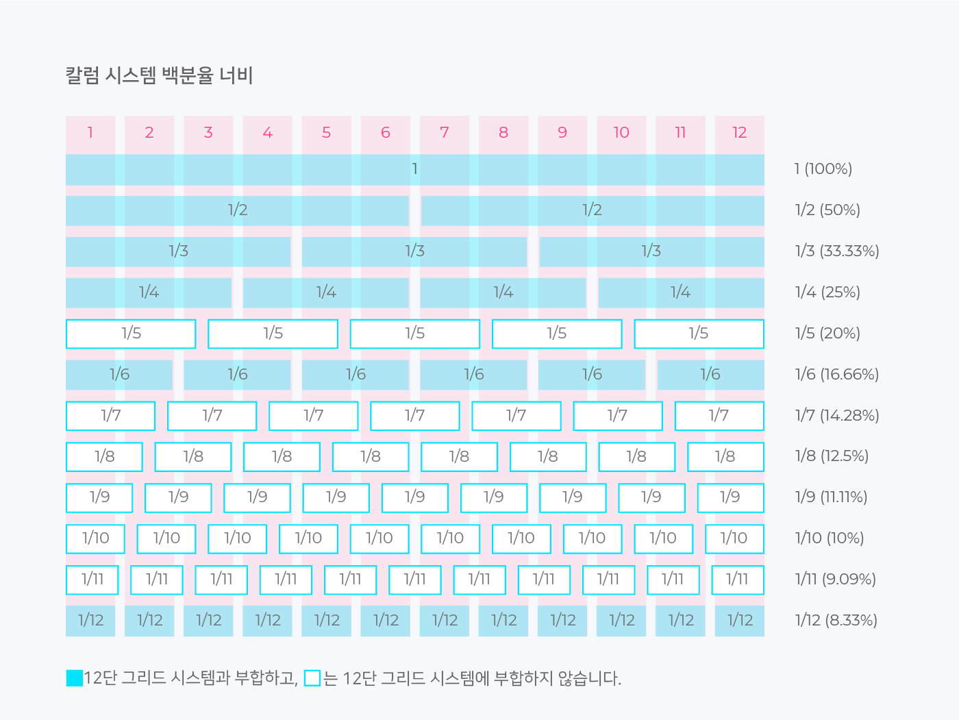 그리드 시스템은 사실상 디자인 작업 시에만 필요합니다. 그리드 시스템은 디자이너와 개발자 간의 소통을 위한 참고사항이며, 그리드 가이드라인에 따라 디자인을 효율적으로 하기 위한 것입니다. 개발 단계에서 그리드 시스템은 사용되지 않으며 분할된 칼럼을 기준으로 백분율로 사용되기 때문에 12, 15개의 고정된 칼럼 개수는 의미가 없습니다. 그러므로 디자인 작업 시에 12칼럼 그리드에서 5분할을 할 수 없다고 생각하지 말고, 위에 이미지로 첨부한 칼럼 시스템 백분율 너비를 참고하여 유연하게 그리드를 사용하는 것이 좋습니다.